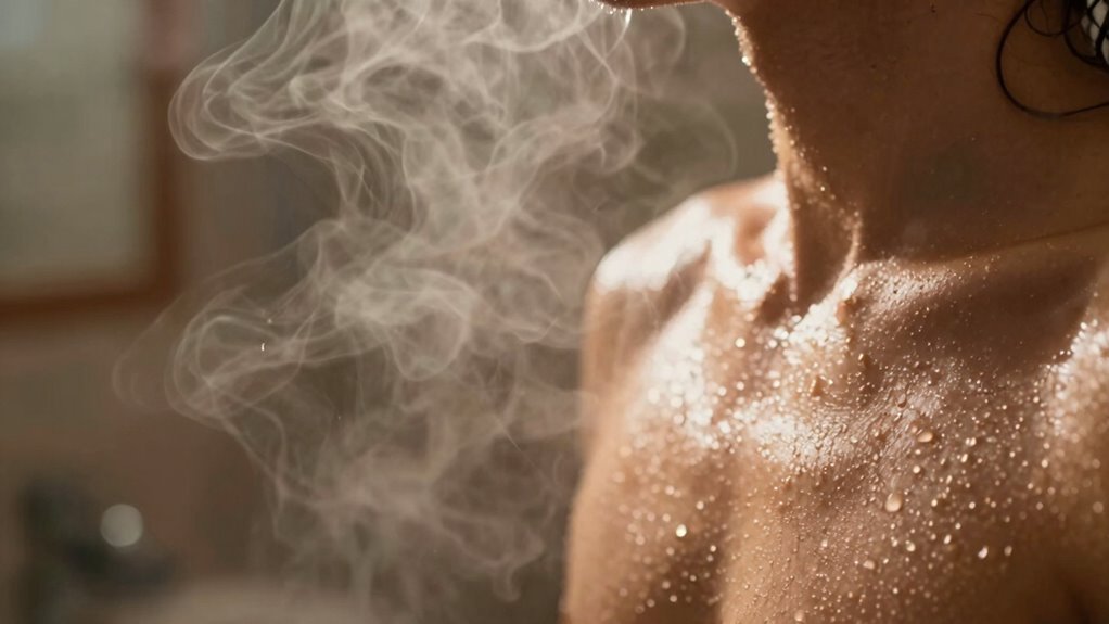 Long hot showers and steam can strip away your skin’s natural oils, weakening its protective barrier and causing dryness and irritation. The heat accelerates oil breakdown, making your skin more vulnerable to dehydration and environmental damage. Signs include flaky patches, redness, and a tight feeling. To protect your skin, learn how to adjust your shower habits and what skincare routines help restore moisture — keep going to discover effective tips.