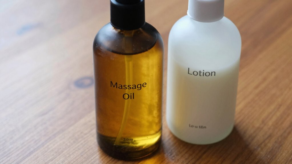 During extended massage sessions, massage oils tend to last longer than lotions due to their heavier, more adhesive consistency. In regard to duration comparison, oils provide superior slip longevity, reducing the need for frequent reapplication. This means you can focus more on the massage without interruption. You’ll appreciate that oils offer a smoother, more consistent glide, making your massage experience more enjoyable and efficient, especially during prolonged sessions.