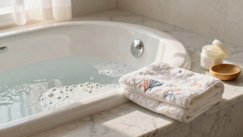 To prevent rashes and irritation, selecting gentle materials for your towels and clothing is essential. Opt for hypoallergenic fabrics that are designed to minimize allergic reactions and skin sensitivities. These fabrics are typically free from dyes, chemicals, and irritants that can trigger rashes. Dermatologist recommendations often include choosing natural fibers like cotton or bamboo, which are softer and less abrasive on sensitive skin. Look for labels that specify hypoallergenic or dermatologist-approved fabrics to ensure you’re making the best choice. Wearing soft, breathable clothing and using gentle towels can considerably reduce friction and irritation. By prioritizing gentle materials, you help protect your skin from unnecessary rashes and discomfort, making your bathing routine more soothing and safe for sensitive skin.