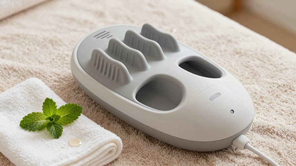 Keeping your foot massager clean is essential for both hygiene and device longevity. To disinfect safely and effectively, start by unplugging the device. Use a soft cloth dampened with a mixture of water and a mild, natural disinfectant like white vinegar. Avoid harsh chemicals that can damage the surface. Regularly wipe down the surfaces to prevent bacteria buildup, which helps with foot odor prevention. For foot skin exfoliation, focus on areas prone to dryness or calluses, ensuring bacteria don’t linger.