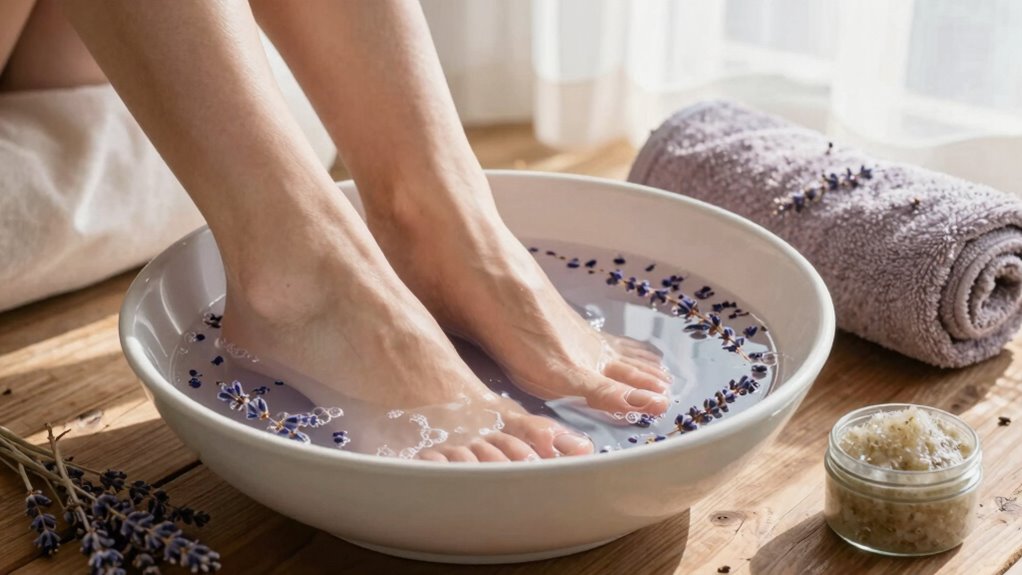 Choosing the right products for your foot pampering routine can make a significant difference in how your feet feel and look. Start by selecting gentle, moisturizing foot creams that nourish dry skin. Look for products with natural ingredients like shea butter or aloe vera. When considering footwear choices, opt for supportive shoes that prevent discomfort and foot problems. Incorporate foot health supplements, such as biotin or magnesium, to promote stronger nails and healthier skin from within. Additionally, choose exfoliating scrubs to remove dead skin effectively. Finally, pick products designed for specific concerns like heel cracks or odor. Making mindful decisions guarantees your routine is both effective and enjoyable, leaving your feet feeling soft, refreshed, and pampered.