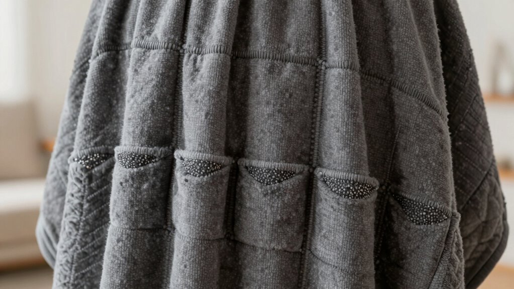 Symmetrical stitching patterns are a clear sign that a weighted blanket has even weight distribution. These stitches create a balanced grid of sections, ensuring the weight is spread uniformly across the blanket. Look for decorative stitching, which often forms aesthetic patterns that are both functional and visually appealing. Consistent stitching lines indicate that the internal weights are securely anchored, preventing shifting that can lead to uneven weight placement. When the stitches are evenly spaced and form symmetrical shapes, you can trust that the weight is distributed evenly throughout the blanket. This careful stitching not only enhances durability but also helps maintain comfort by avoiding lumps or areas with concentrated weight. Recognizing these patterns helps you select a blanket that provides the consistent pressure you need. Proper weight placement ensures that the benefits of a weighted blanket are fully realized and that comfort is maintained throughout use. Additionally, stitching quality plays a crucial role in how well the weight stays evenly distributed over time.