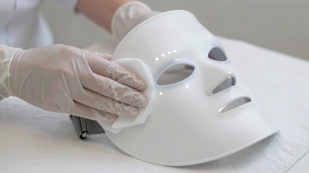 For ideal results, you should clean your LED mask regularly, ideally after each use or at least 2-3 times a week if you wear it frequently. Consistent cleaning helps maintain skin hydration and prevents buildup that can compromise product compatibility. To optimize your routine, consider these points: