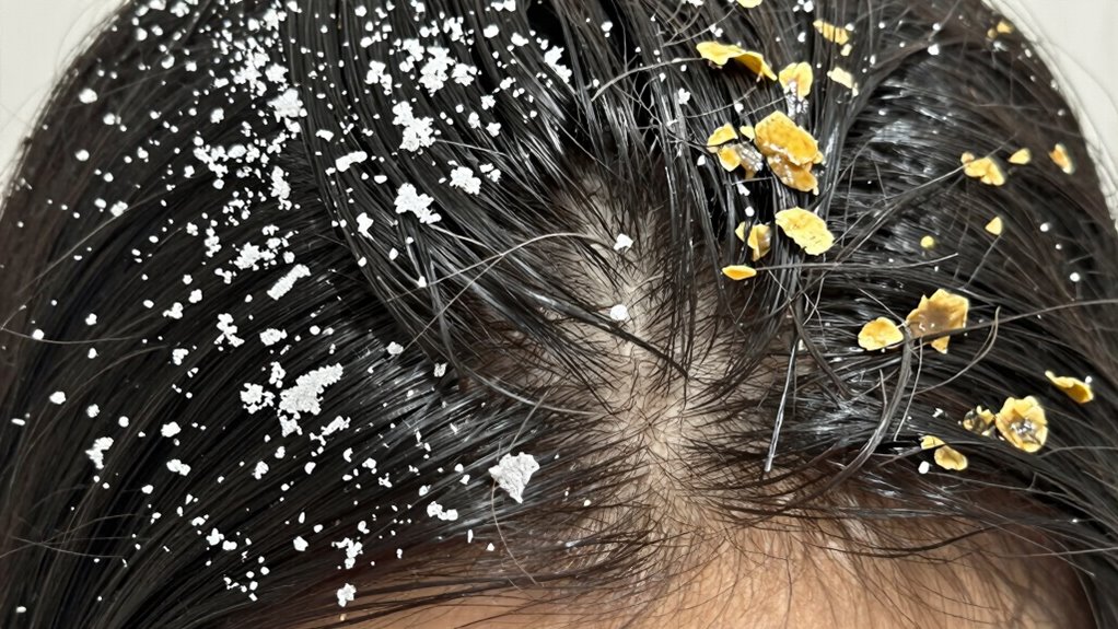 To tell dry scalp flakes from dandruff, look at their appearance and texture. Dry flakes are small, powdery, and lightweight, usually loose and not greasy. Dandruff flakes are larger, oily, and often sticky or waxy, clinging to your scalp or hair. The feeling is different too—dry flakes are crumbly, whereas dandruff feels greasy. Want to learn more about how to identify and treat these conditions? Keep going to find out!