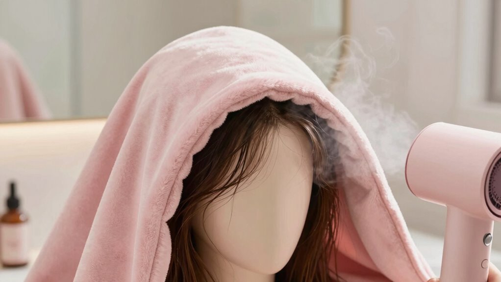 To keep your hair healthy, avoid over-drying by paying attention to your dryer’s settings and your hair’s signals. Did you know that over-dried hair can be 60% more prone to breakage? By choosing the right temperature, monitoring your progress, and using proper conditioning, you can achieve salon-quality results at home without damage. Stay attentive and gentle—your hair will thank you for it, revealing its natural shine and strength.