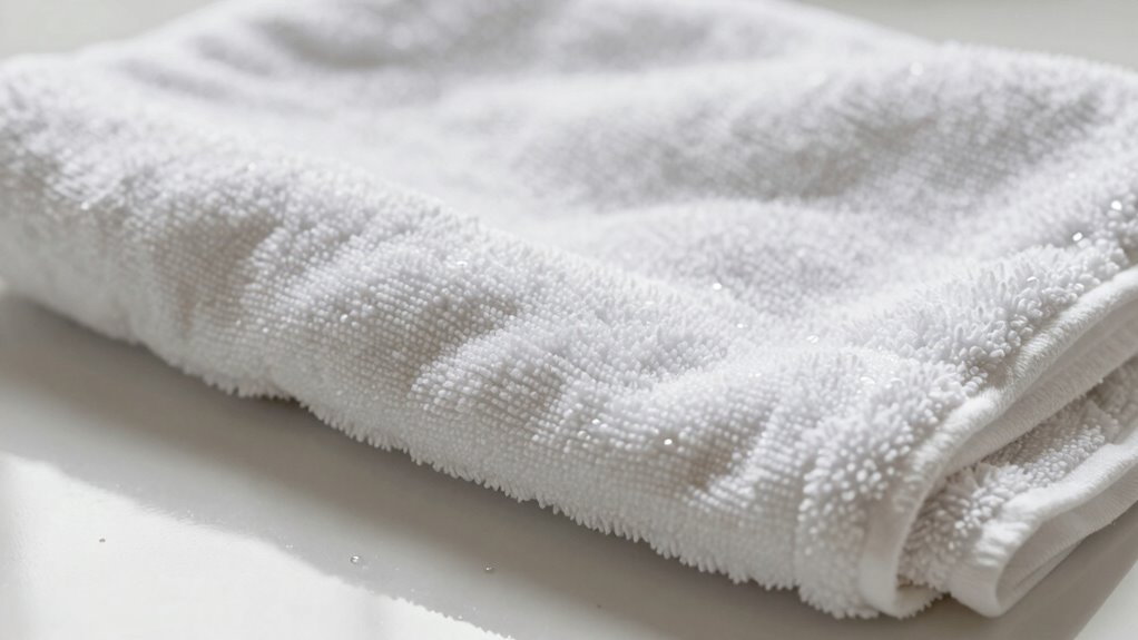 Softening treatments substantially alter how towels feel against your skin and how well they perform. When you use fabric softeners or improper detergent selection, towels often lose their absorbency, feeling slick or slimy instead of plush. Properly maintained towels remain fluffy and absorbent because they retain their natural fibers. Softened towels tend to feel less crisp and may cling to your skin rather than absorb moisture effectively. Additionally, towel folding techniques matter—folding damp towels or packing them tightly can trap residues and reduce absorbency. To keep your towels feeling and performing their best, choose a gentle detergent suited to your water type, avoid over-softening, and fold towels loosely after washing. This approach preserves their natural feel and absorbency longer. Proper maintenance of towels is essential for preserving their quality and extending their lifespan.