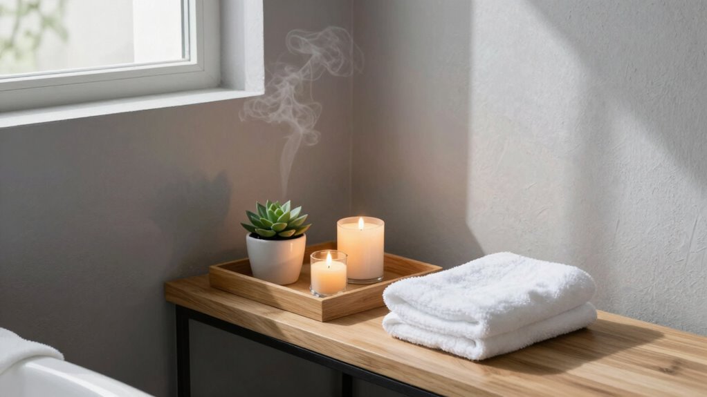Establishing consistent self-care rituals is key to transforming your micro-spa into a calming retreat you can rely on daily. When you create calming routines, you anchor yourself in moments of peace amid a busy life. Incorporate mindful breathing exercises to center your mind and relax your body. By sticking to a routine, you build a dependable sanctuary where stress melts away.