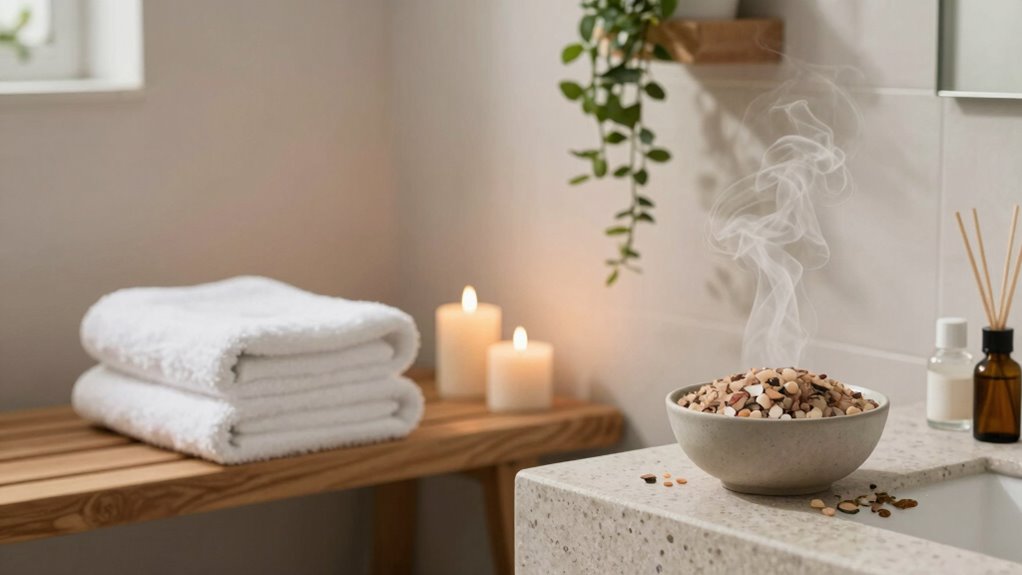 Incorporating simple mindfulness techniques into your spa routine can considerably deepen your sense of relaxation. Focus on mindfulness meditation and breath awareness to stay present and calm. As you settle into your ritual, take slow, deliberate breaths, noticing each inhale and exhale. This helps quiet racing thoughts and anchors you in the moment. To enhance your experience, try these techniques: