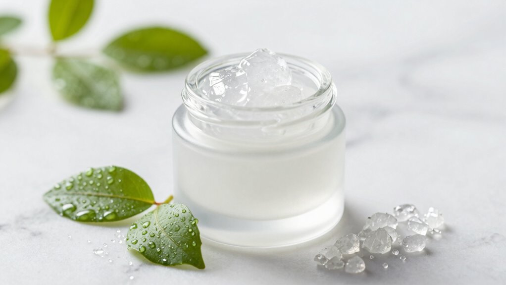 For those with dry skin, urea can be a highly effective ingredient that helps restore moisture and improve skin texture. It works by breaking down dead skin cells, enhancing natural exfoliation, and promoting deeper hydration. Urea’s ability to attract and retain water makes it a powerful hydration technique, especially when combined with other moisturizing ingredients for ingredient synergy. This synergy boosts the skin’s barrier function, reducing dryness and flakiness. Urea penetrates deeply, delivering long-lasting moisture and leaving your skin feeling softer and more supple. It’s particularly suitable for very dry, rough, or cracked skin, helping to restore a smoother, healthier appearance. Just keep in mind that consistent use can deliver significant benefits for dry skin concerns.
