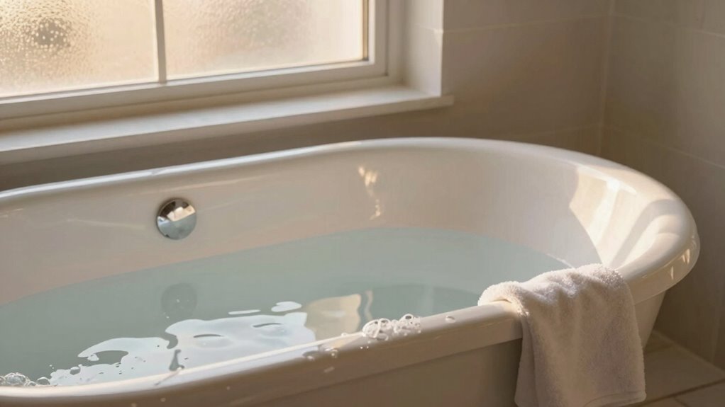 A no-rush bath should ideally last about 20 to 30 minutes, giving you enough time for true relaxation without overdoing it. During this bath, focus on bath relaxation by maintaining a comfortable water temperature, around 98 to 102°F (37 to 39°C), which helps soothe muscles and calm your mind. Keep the duration moderate to maximize the calming effects while avoiding skin dryness or fatigue.