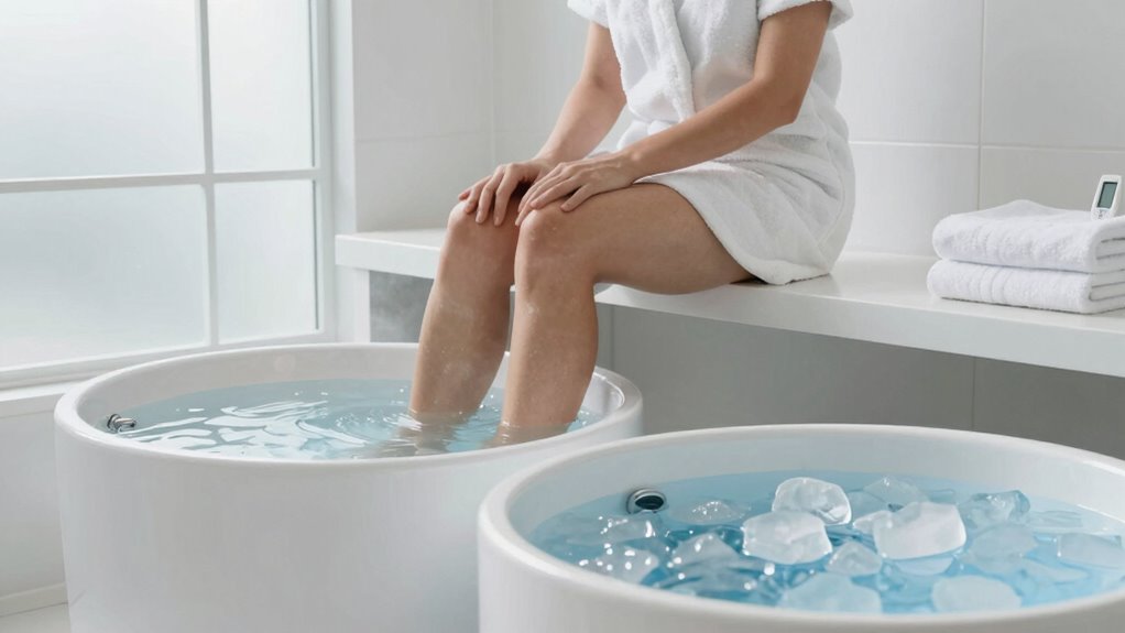 Contrast therapy at home involves alternating between warm and cold immersions to boost recovery safely and effectively. Start by setting up a comfortable space with water at safe temperatures, using a thermometer to keep things in check. Begin with a warm soak, then switch to cold, cycling 1-3 minutes each time. Stick to recommended durations and listen to your body. Want step-by-step guidance to do this safely and effectively? Keep going to learn more.