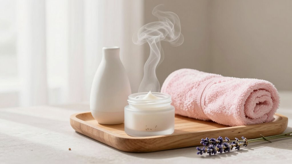 Gently, you can embrace essential oils in your routine, but tread softly, as skin sensitivity calls for caution. Opt for soothing, rare blends like chamomile or lavender, and always dilute them well to prevent irritation. Incorporating essential oils thoughtfully enhances your minimalist spa ritual, adding a calming aroma while respecting your skin’s delicate nature. Remember, less is more when honoring your skin’s gentle needs.