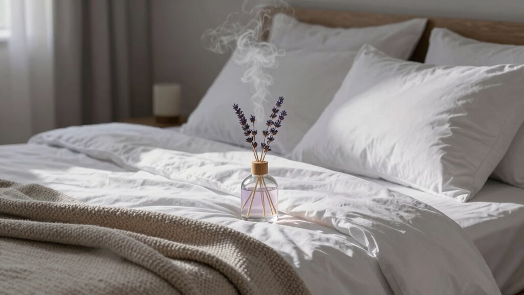 Aromatherapy is a popular way to help improve sleep, but scientific evidence shows its effects are modest and vary from person to person. Scents like lavender, chamomile, and bergamot may promote relaxation, but results depend on individual preferences and placebo responses. It’s safe when used properly, but it shouldn’t replace other sleep practices or medical advice. To learn more about how to use aromatherapy effectively and safely, keep exploring.