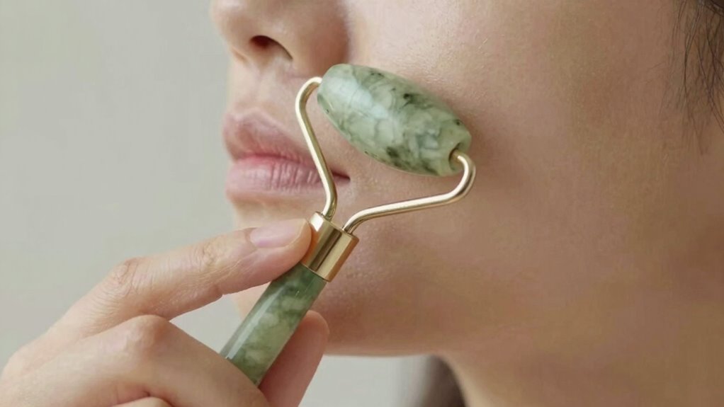 To get the best results, use your facial roller with upward and outward strokes. Start from the center of your face and guide the roller toward your ears and jawline. Light pressure is key—let the roller do the work—while you follow these proper directions to promote lymphatic drainage, relax muscles, and brighten your skin. Stick with this technique consistently, and you’ll improve your skincare routine. Keep going to discover more tips for a radiant, refreshed look.