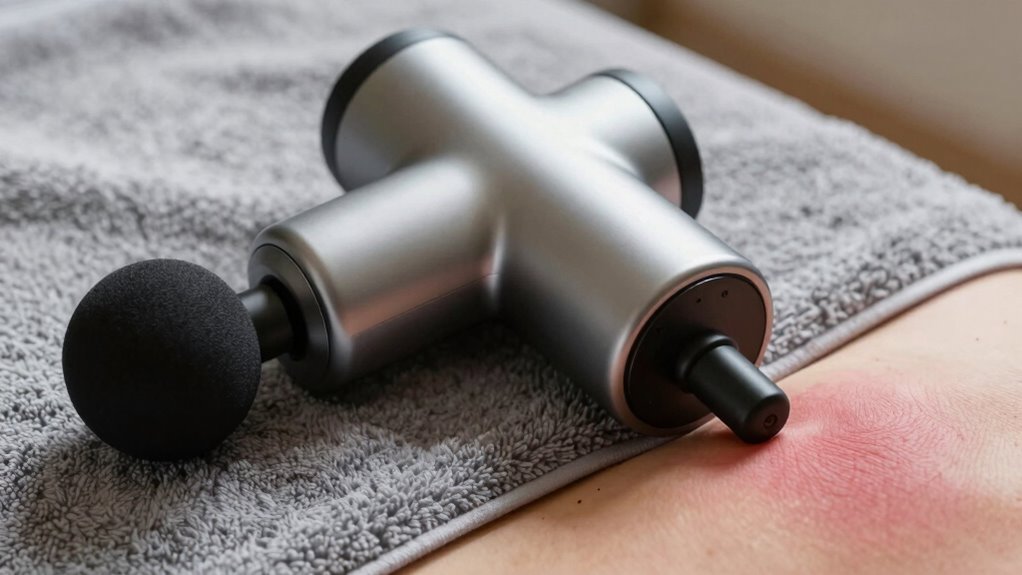 Noticing a sudden decrease in your range of motion after using your massage gun is a key sign you’re overdoing it. When muscles become too sore or tender, they can tighten up, limiting movement. This often results in stiffness that hampers your posture correction efforts and makes stretching routines more difficult. If you find yourself unable to move comfortably or feel persistent tightness, it’s time to cut back. Overuse can cause inflammation or trigger muscle guarding, which reduces flexibility. To avoid this, listen to your body’s signals, reduce massage time, and incorporate gentle stretching routines. Proper recovery and moderation help maintain your mobility, ensuring your massage gun benefits without causing setbacks. Remember, balance is key to effective muscle recovery, and incorporating proper glycolic acid benefits can further support skin recovery and overall health. Being aware of signs of overuse can help you prevent setbacks and optimize your recovery process.