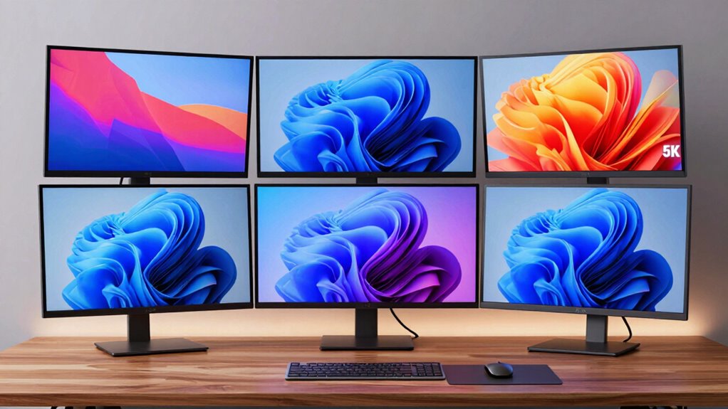 Color accuracy and calibration vary quite a bit across different 5K monitor models. Some offer factory calibration with high color fidelity, ideal for professional work, while others need manual calibration for better precision. I recommend looking for monitors with wide color gamuts like DCI-P3 or Adobe RGB, and those that support hardware calibration. This guarantees consistent, accurate colors, which are essential for creative tasks and seamless editing.