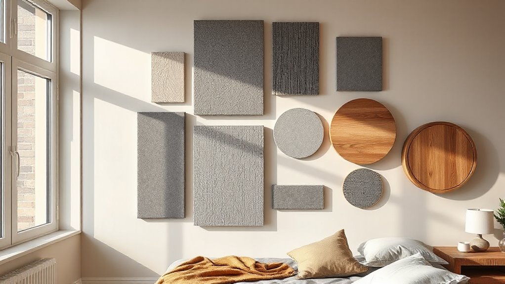 Choosing the right acoustic panels for your bedroom starts with understanding your room’s size. You need to match the panels’ dimensions and coverage area to your space to ensure effective sound absorption. Measure your room’s square footage and ceiling height to determine how many panels you’ll need. Larger rooms typically require more panels or higher-density materials to reduce echo and reverb effectively. Pay attention to the Noise Reduction Coefficient (NRC) ratings; higher NRC panels work better in bigger spaces. Additionally, select panels that fit well within your room’s layout for seamless installation and aesthetic harmony. Proper sizing and placement make a significant difference, ensuring your acoustic treatment is both functional and visually pleasing.