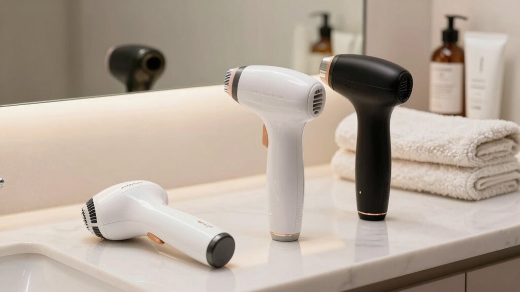 Safety features are essential to guarantee that at-home laser hair removal treatments are both effective and risk-free. Skin tone sensors are crucial, preventing accidental flashes on unsuitable skin types and reducing the risk of burns. Automatic shut-off mechanisms help avoid overexposure, ensuring the device turns off after a set time or if it detects potential issues. Multiple adjustable energy levels let me customize treatments safely based on my skin sensitivity, providing control without compromising safety. Built-in cooling systems or contact cooling technology minimize discomfort and protect my skin during use. Additionally, clear safety instructions and protective eyewear are vital, helping me operate the device correctly and preventing eye damage. These features give me confidence in my at-home treatments, making safety a top priority.