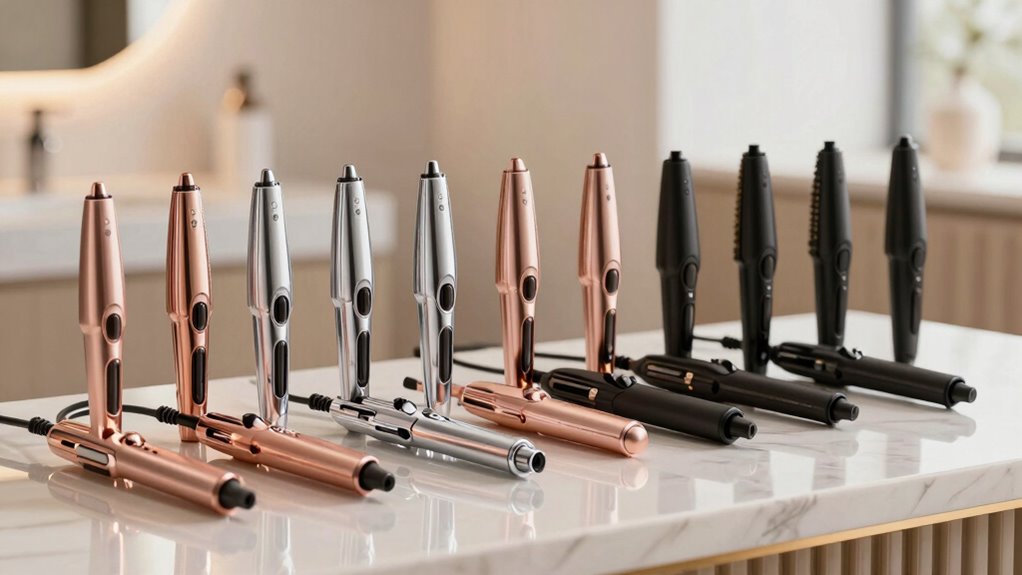 Are you wondering how barrel size affects your styling results? The size of the barrel plays a vital role in shaping your hairstyle. Smaller barrels, around 0.3 to 1 inch, create tight, defined curls, perfect for a bouncy, classic look. Larger barrels, from 1.25 to 1.5 inches, produce loose waves, ideal for a relaxed, voluminous vibe. The diameter also influences how quickly you can style your hair—bigger barrels cover more area, saving time. Many versatile curling irons come with interchangeable or multiple barrel sizes, giving you the flexibility to switch styles easily. For everyday looks, a 1-inch medium barrel offers a great balance of volume and tightness, while larger options are best for soft, flowing waves. Choose based on your preferred curl type and styling speed.