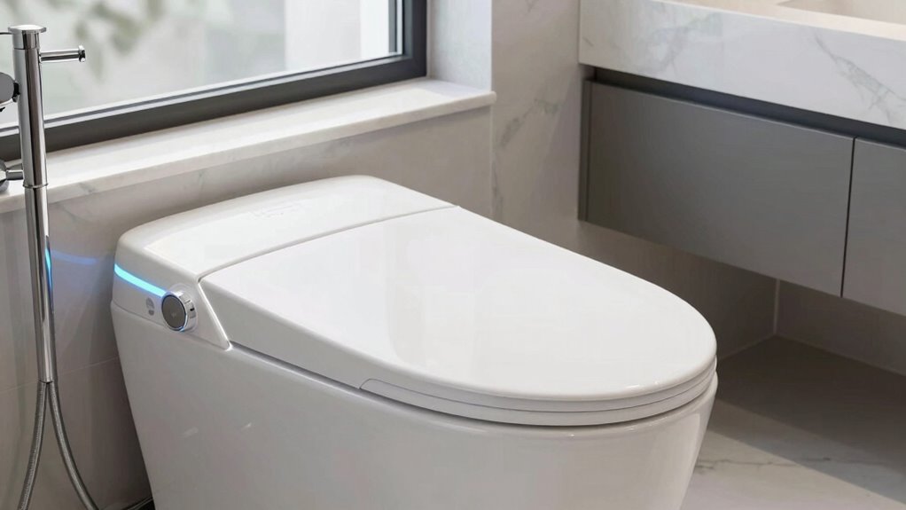 Choosing a bidet toilet seat with additional comfort options can considerably enhance your bathroom experience. Adjustable heated seats ensure personalized warmth, making cold mornings more tolerable. Multiple washing modes, like oscillating and pulsating streams, let you customize your cleansing for better comfort. Warm air dryers with adjustable settings eliminate the need for toilet paper, adding convenience and reducing waste. Features like nightlights improve visibility at night, while remote controls make operation simple and accessible. Ergonomically designed seats with soft-close lids not only reduce noise but also create a more relaxing environment. These comfort features are especially beneficial for those with mobility issues or sensitivity, ensuring a more pleasant, hygienic, and stress-free experience every time you use the toilet.