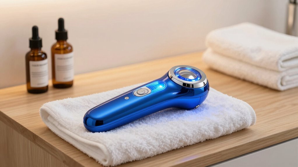 When it comes to at-home skincare, portability and thoughtful design can make all the difference in guaranteeing consistent and convenient use. A compact, lightweight device is easy to carry during travel or move effortlessly between rooms, making skincare routines more flexible. Ergonomic designs and simple controls boost comfort and help you operate the device with ease, encouraging regular use. Wireless, rechargeable models cut down on clutter and eliminate cords, giving you freedom to treat anywhere. Small size ensures discreet storage, perfect for limited space or clutter-free countertops. Additionally, intuitive interfaces make setup quick and straightforward. Prioritizing portability and sleek design means your blue light acne device can seamlessly integrate into your daily routine, enhancing convenience without sacrificing functionality.