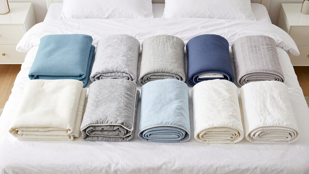 Cooling blankets regulate body temperature by using breathable, moisture-wicking fabrics that promote airflow and prevent heat buildup. They often incorporate cooling technology like gel infusions or phase-change materials that absorb and release heat as needed. I find that these features help me stay cool and comfortable throughout the night, preventing overheating. The combination of light materials and advanced cooling tech ensures I get restful sleep without feeling too hot or sweaty.