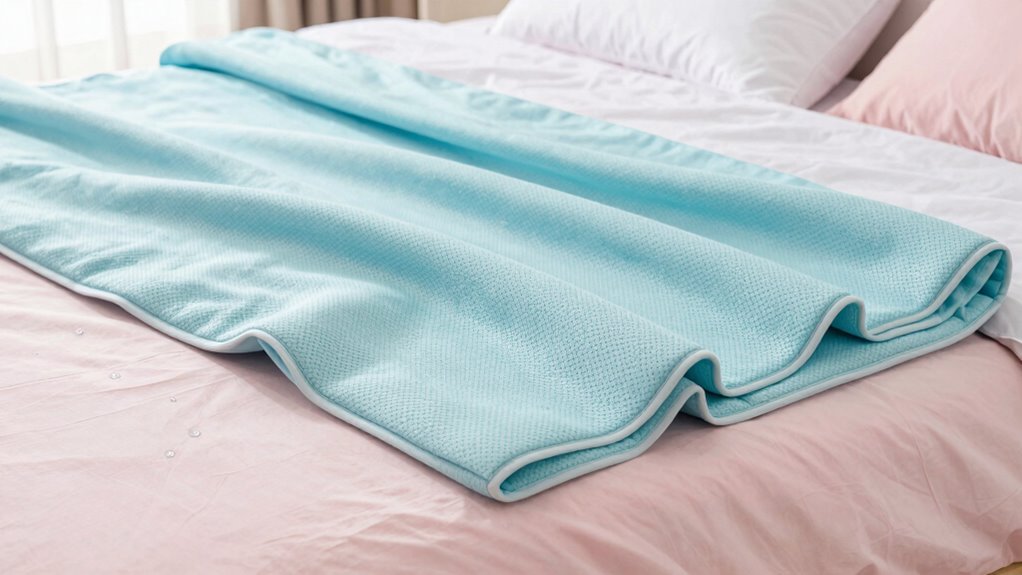 Cooling blankets prevent overheating during summer sleep by using breathable fabrics and moisture-wicking materials that promote airflow and keep you dry. They often feature cooling technology, like gel-infused fibers or phase-change materials, which absorb and dissipate heat. I find that these blankets help regulate my body temperature, making my sleep more comfortable and preventing that sticky, overheated feeling, especially during hot nights.