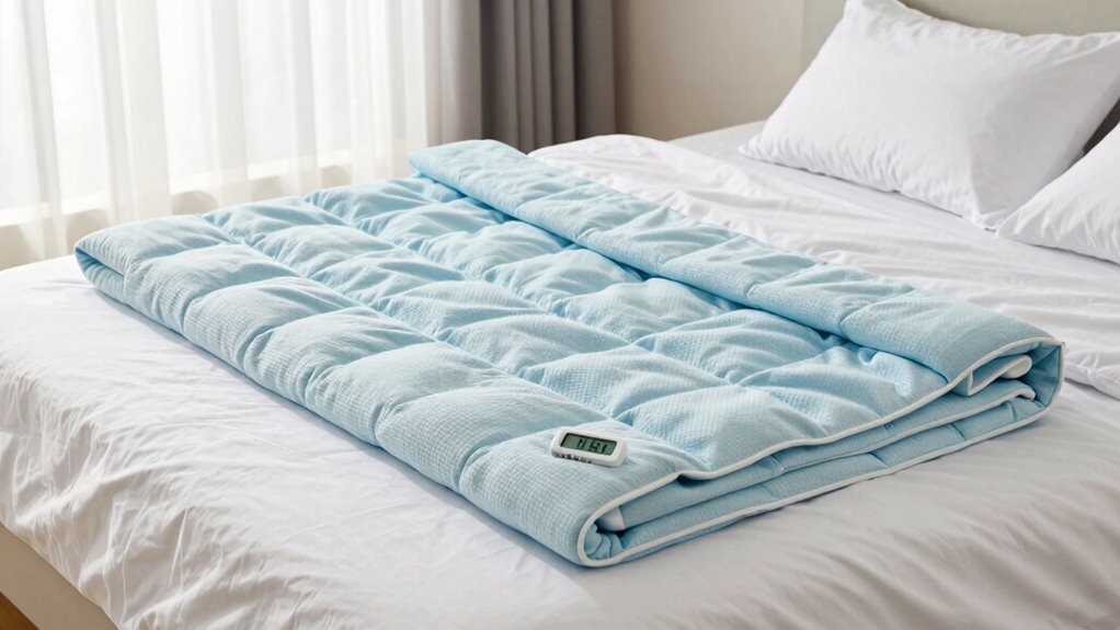 Maintaining your cooling weighted blanket properly is essential for preserving its performance and extending its lifespan. Most blankets are machine washable, but I recommend using cold water and a gentle cycle to prevent damage. Hand washing and air drying are often better for protecting the fabric and preventing bead leaks. To make cleaning easier, using a duvet cover can shield the blanket from frequent washes. Be sure to avoid high heat during drying, as excessive heat can weaken stitches and cause beads to shift. Regularly inspecting your blanket for loose threads or bead leaks helps ensure safety and ideal performance over time. Proper care not only maintains the blanket’s cooling properties but also prolongs its overall durability, making it a worthwhile investment.