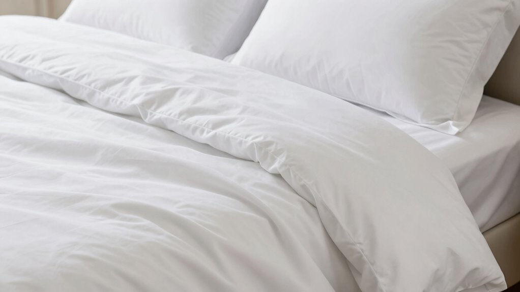 A deep pocket design is essential for guaranteeing your Egyptian cotton sheets stay secure on your mattress, especially if you have a thicker bed. These sheets can fit mattresses up to 15-18 inches deep, providing versatility across different styles and sizes. Fully elasticized edges help keep the sheets snug and wrinkle-free overnight, reducing the need for constant readjustments. Properly fitted deep pockets also improve airflow and insulation, which can contribute to a cooler sleep environment. They minimize bunching and shifting, enhancing overall comfort. If you’re looking for sheets that stay in place and maintain a smooth appearance, a deep pocket design is a must. It ensures your sheets stay put, no matter how much you toss and turn during the night.