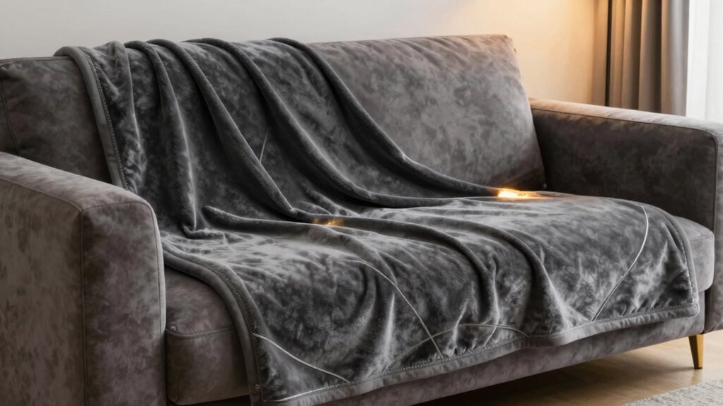 Maintaining an electric heated blanket for your sofa doesn’t have to be complicated if you pay attention to a few key features. First, choose a blanket with a detachable controller—this makes cleaning much easier since you can remove the electronics before washing. Look for materials like polyester, flannel, or sherpa that are machine washable and designed for easy care. Always check the care instructions; gentle cycle washing and low-heat drying help extend the blanket’s lifespan. Ensure the heating wires are securely embedded and the fabric is durable, so regular cleaning doesn’t cause damage. Ultimately, opt for products with safety certifications like ETL or FCC, as they often include features that simplify safe maintenance and ensure the blanket remains in good condition over time.