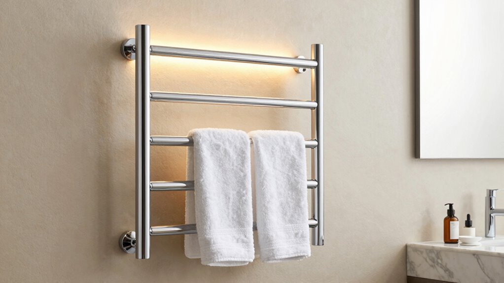Imagine wrapping yourself in a warm, fluffy towel on a chilly morning, feeling the gentle heat cocoon you like a cozy hug. With these top heated towel racks, that comforting warmth is always within reach. Whether you prefer sleek stainless steel or matte black finishes, I’ve got options to suit your style. Invest in one, and transform your bathroom into a haven of warmth and relaxation—your skin will thank you every time.