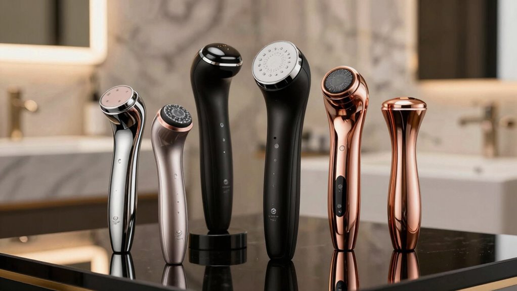 Imagine gently revealing your skin’s natural glow—safety features guarantee that happens without harm. Look for devices with automatic shut-off to prevent overuse, waterproof designs for safe handling, and adjustable intensity settings for personalized comfort. A built-in sensor to monitor skin sensitivity is a bonus, reducing risks of irritation. These features give me peace of mind, letting me indulge in my skincare routine confidently.