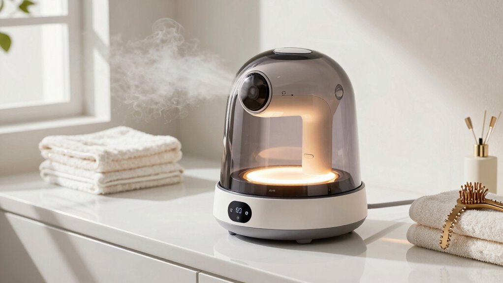 Safety features are vital to guarantee your hooded hair steamer operates securely and minimizes risks. Look for models with automatic shut-off, which turn the device off if it overheats, preventing accidents. Overheat protection systems are essential—they monitor and regulate temperature, ensuring safe use every time. Water level sensors alert you when the reservoir is low, avoiding dry burning that could damage the steamer or cause hazards. Built-in thermostats help maintain consistent steam temperatures, reducing the risk of burns or scalp irritation. Additionally, check for safety certifications like TUV, CE, or UL, which indicate the device meets industry safety standards. Prioritizing these features helps guarantee your deep conditioning sessions are both effective and safe, giving you peace of mind during use.