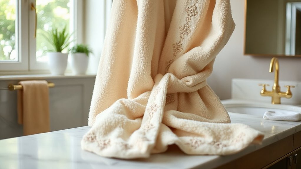 When evaluating hotel bathrobes, the design and style features play a crucial role in both comfort and visual appeal. Elements like shawl collars and kimono styles not only add elegance but also affect how cozy the robe feels. Color choices, trim details, and pocket placement enhance the robe’s attractiveness and practicality. Adjustable belts and wide sleeves improve fit and allow easier movement, making the robe suitable for various body types. Whether a unisex or gender-specific design, these choices influence guest satisfaction. Elegant touches like piping or plush velour finishes can elevate the robe’s luxury feel, creating a more sophisticated experience. Overall, thoughtful design and style elements ensure the robe looks beautiful and functions well, making it a key factor in choosing the perfect hotel bathrobe.