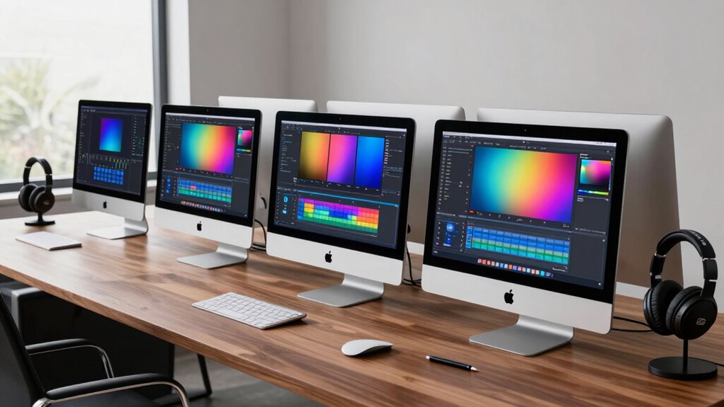 If you’re looking for the best iMacs for video editing in 2026, I recommend considering models with the latest M4 chip, a vibrant 4.5K Retina display, and at least 16GB of memory. These Macs offer powerful processing, superb color accuracy, and ample storage, making them ideal for handling demanding projects. For a detailed breakdown of the top six options and what to look for, keep exploring — you’ll find the perfect fit.