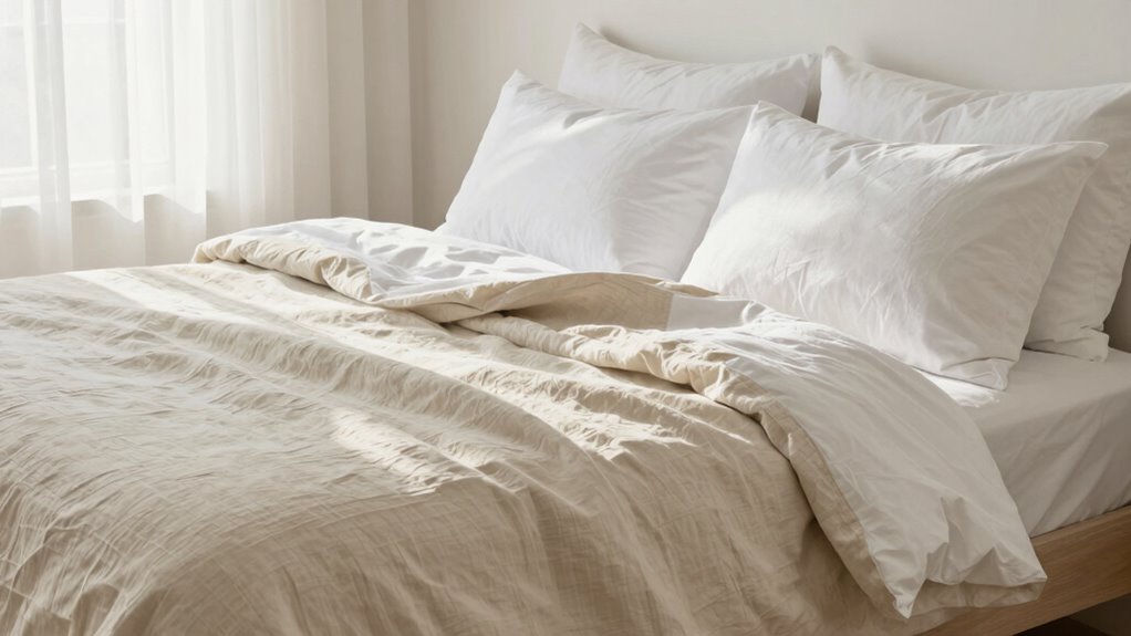 Ever wonder if linen sheets suit all skin types? I can tell you they’re generally a great choice because linen is naturally breathable and hypoallergenic. I personally find they’re gentle on sensitive skin and don’t trap heat or moisture, making them comfortable for everyone. Plus, their natural fibers resist bacteria and mold, so they’re a healthy, versatile option for any skin type.