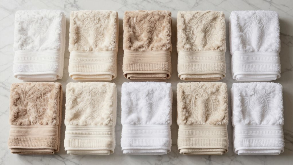 Choosing the right luxury Egyptian cotton towel set starts with paying close attention to material quality standards. I look for towels made from 100% Egyptian cotton, renowned for its long fibers that create softer, more durable fabrics. Checking for OEKO-TEX certification is essential, as it guarantees the towels are free from harmful chemicals and safe for sensitive skin. I prefer heavyweight towels with a high GSM, around 600 or above, which indicates superior absorbency and quality. Additionally, I verify that the cotton fibers are long-staple, contributing to increased strength and longevity. Ultimately, I consider whether the material is certified organic or sustainably produced, ensuring environmentally friendly sourcing. These standards help me select towels that are luxurious, safe, and built to last.