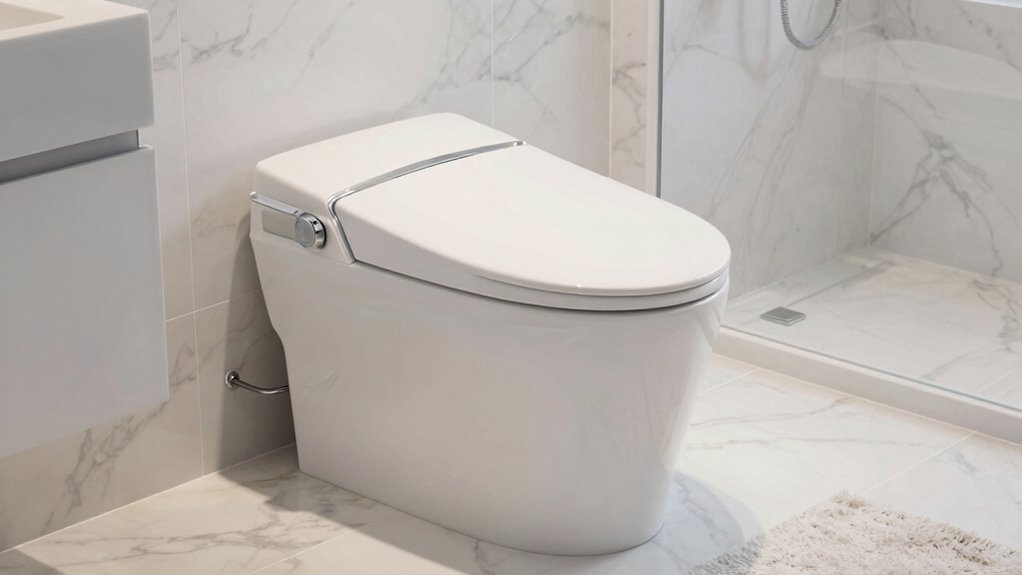 Choosing a luxury heated bidet toilet seat with advanced hygiene features can substantially improve your bathroom experience. Features like self-cleaning nozzles and antimicrobial coatings help keep everything sanitary and reduce bacterial buildup. Technologies like EWATER+ or EWATER+ systems sanitize the wand before and after each use, ensuring a hygienic cleanse every time. Built-in deodorizers and air purifiers also contribute to a fresher bathroom environment. Adjustable spray modes, including pulsating and oscillating streams, allow for targeted cleaning, enhancing personal hygiene. Additionally, bowl premist technology and stainless steel nozzles promote better sanitation and make maintenance easier. These features work together to provide a cleaner, more comfortable experience, giving you peace of mind that your bidet is as hygienic as it is luxurious.