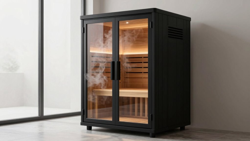 When selecting a luxury portable steam sauna, I consider factors like size and capacity to make certain it fits my space and needs. I also look at heating efficiency and safety features to guarantee a quick, safe, and enjoyable experience. Finally, I prioritize portability, storage options, and durable materials for long-term use and convenience.