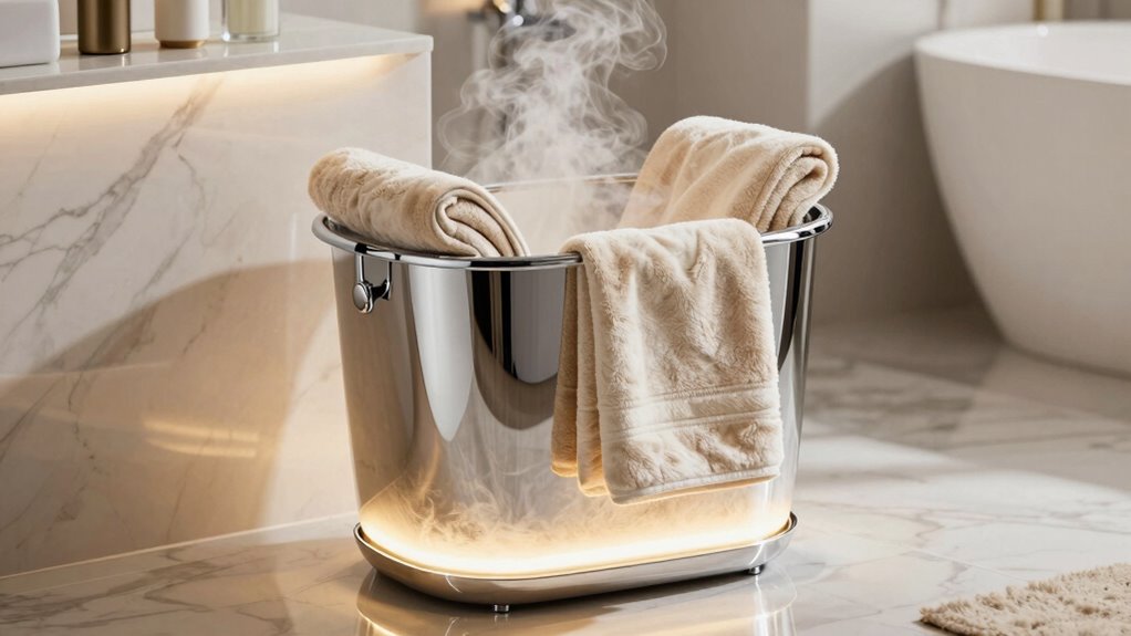Did you know that high-end towel warmer buckets often use stainless steel, which resists corrosion and lasts up to 20 years? I’ve found that the materials in these luxury products are incredibly durable, designed to withstand daily use without tarnishing or damage. I trust that the quality craftsmanship behind these warmers guarantees long-lasting performance, making them a worthwhile investment for your comfort and style.