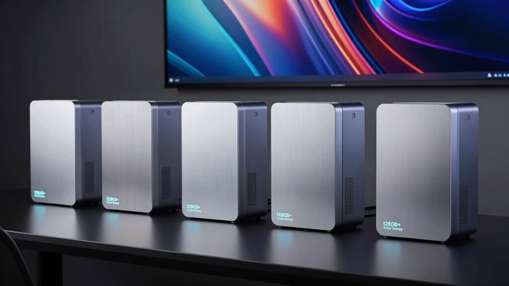 Based on current trends and future upgrades, the top four Mac Studio models with 128GB+ unified memory in 2026 will likely include the latest configurations with Apple Silicon’s most advanced chips, such as M4 Pro or M4 Ultra, offering exceptional performance and efficiency. These models will seamlessly integrate with the Apple ecosystem, support demanding workflows, and feature robust connectivity options. Keep exploring, and you’ll discover which options best suit your professional and sustainability goals.