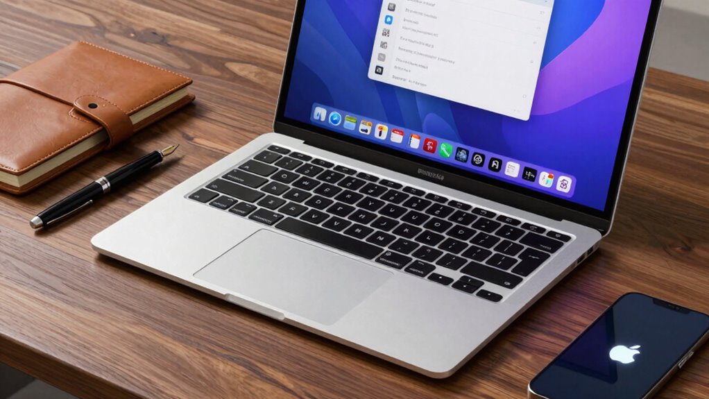 Since seamless integration with other Apple devices can considerably boost productivity, it’s essential to contemplate ecosystem compatibility when selecting a MacBook Air for business. When your MacBook works smoothly with your iPhone, iPad, and Apple Watch, tasks like mirroring screens, messaging, and copying data across devices become effortless. This synchronization reduces workflow disruptions and saves time. Additionally, the ecosystem ensures that your software stays up-to-date with consistent security features, safeguarding sensitive business information. Native apps like Microsoft 365 Copilot and Adobe Creative Cloud perform ideally within this environment, enhancing your efficiency. Plus, Apple’s ecosystem offers enhanced privacy protections that are integrated across hardware and software, giving you peace of mind. Overall, ecosystem compatibility is a key factor for a seamless, secure, and productive business experience.