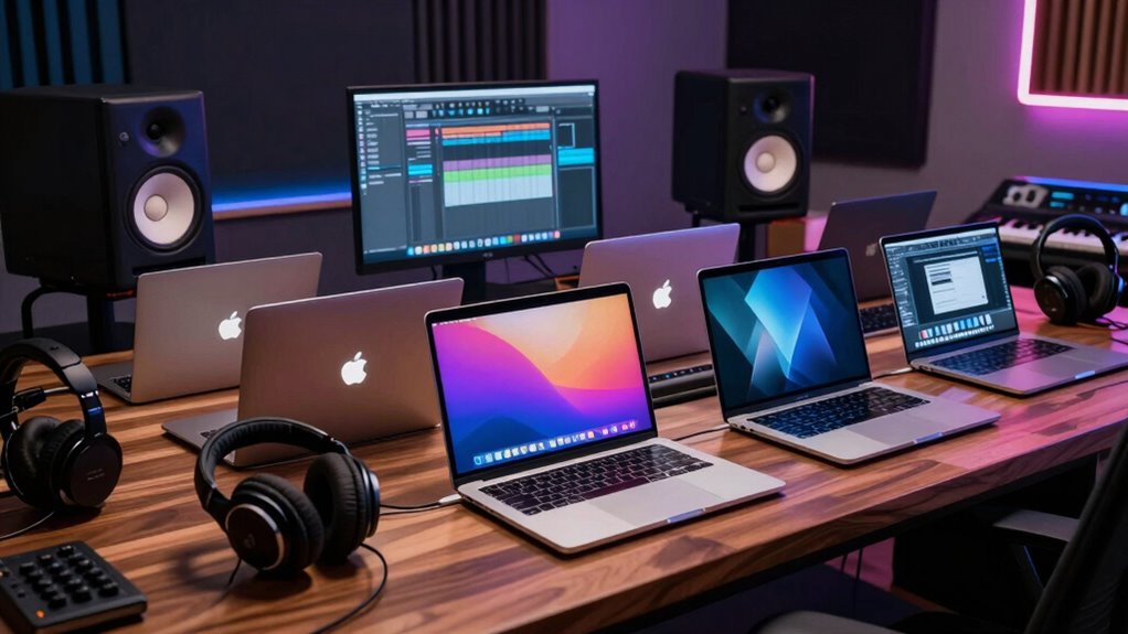 When choosing a MacBook Pro for music production, I consider several key factors to guarantee it meets my needs. Things like processing power, memory, storage options, and audio quality are essential, along with having the right ports for connectivity. Let’s explore these points so you can pick the best model for your setup.