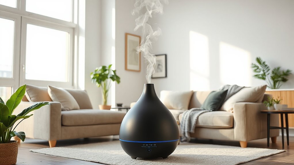 Choosing a nebulizing essential oil diffuser for a large room means paying close attention to its coverage area. You want a diffuser whose maximum coverage matches or exceeds your space, typically between 600 to 2000 square feet. Check the diffuser’s specified square footage capacity to guarantee it can scent the entire room effectively without weak spots. Larger coverage areas usually require higher mist output and more powerful diffusion technology to maintain consistent aroma distribution. Many models offer adjustable mist settings, allowing you to optimize scent diffusion based on your room size and preferences. Keep in mind, exceeding the recommended coverage can weaken fragrance dispersal and diminish aromatherapy benefits. Selecting the right coverage size is vital for achieving consistent, effective scenting in your large space.