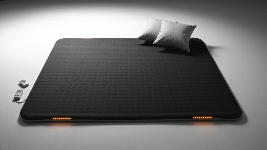 To maximize the effectiveness of your PEMF therapy, it’s important to pay attention to the technology features of the mat. Look for adjustable frequency ranges, ideally from 1 to 99 Hz, so you can customize sessions based on your specific needs. The number and placement of coils matter too; more coils mean broader electromagnetic coverage, enhancing recovery. Check if the device offers programmable timers and intensity controls to fine-tune session duration and strength. Ensure it uses proven pulsed electromagnetic fields (PEMF) that support cellular repair and tissue regeneration. Safety features like auto shut-off, overheat protection, and proper certification are essential for secure, reliable use. These tech features help optimize therapy, making your recovery sessions more effective and safe.