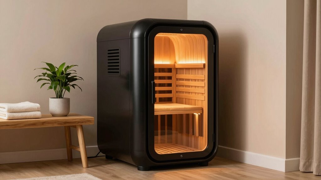 Think of my portable infrared sauna as a gentle whisper rather than a loud roar. During use, it produces minimal noise, mostly the soft hum of heating elements, which I barely notice. It’s like a cozy lullaby that helps me relax without disturbing my surroundings. This quiet operation makes it perfect for apartment living, where noise levels matter. I can enjoy my sauna without worrying about bothering neighbors or roommates.