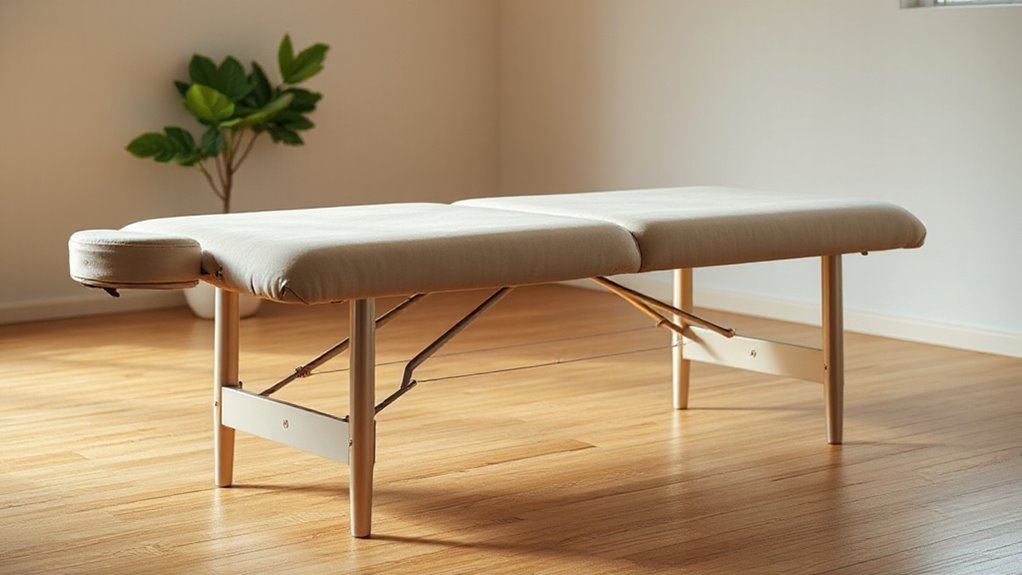 When selecting a portable massage table for deep tissue work, ease of setup is crucial to guarantee a smooth shift between clients. I look for tables that can be assembled in under two minutes without tools, saving valuable time. Lightweight designs, weighing between 27 to 34 pounds, make transportation effortless and quick to deploy. Foldable frames with automatic leg locking mechanisms simplify the process, eliminating the need for extra tools or complex adjustments. Multi-position adjustable features, like height settings from 23 to 35 inches, allow me to customize the table for ergonomic comfort rapidly. Clear, intuitive locking and adjustment systems ensure stability and safety while maintaining quick setup. Overall, a table that combines simplicity, speed, and stability enhances my workflow and client experience.