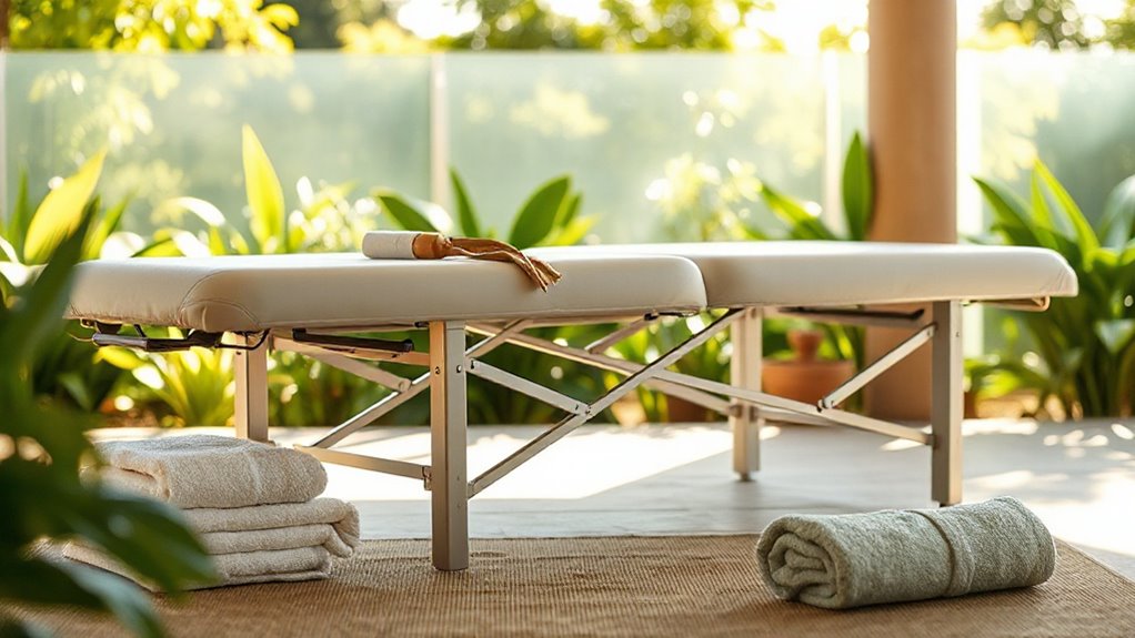 When it comes to portable massage tables, ease of setup can make or break your efficiency during appointments. I look for tables that unfold quickly, ideally in under a minute, with minimal effort. Tool-free assembly is a major plus, saving time and reducing frustration. Features like automatic leg locking mechanisms and clearly marked, adjustable height settings help me customize the table’s position smoothly without extra tools. Lightweight frames, usually under 35 pounds, make transport effortless and allow me to set up in different locations with ease. Foldable designs with secure clasps and carrying cases add convenience, ensuring the table is easy to handle and store. When setup is straightforward, I can focus more on my client and less on fiddling with equipment.