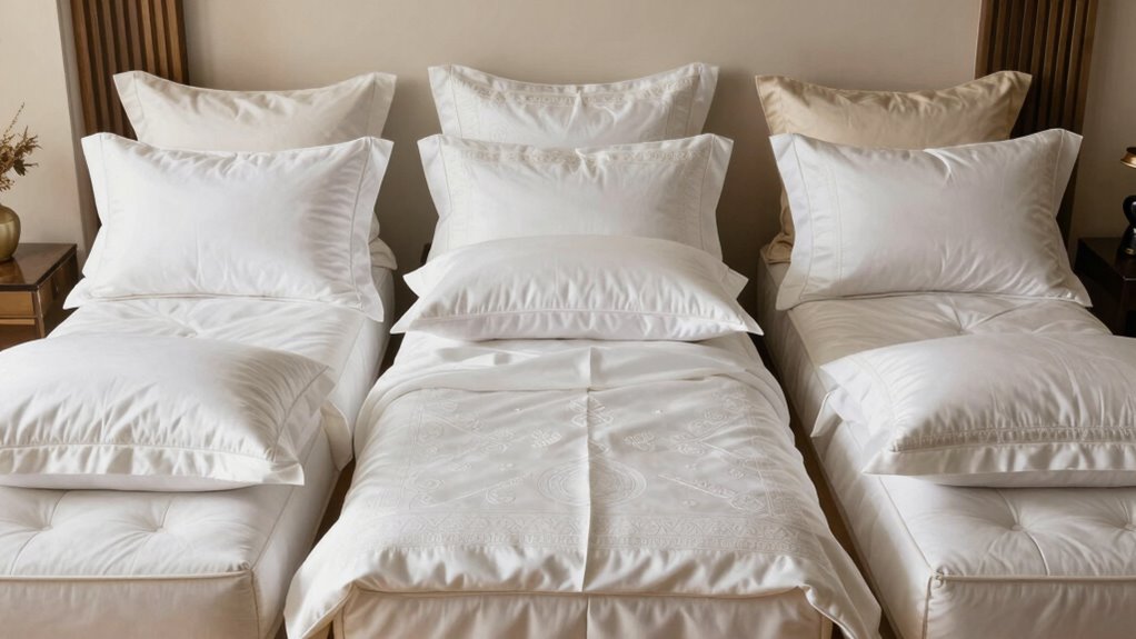 Have you ever wondered how the thread count influences the quality of Egyptian cotton sheets? Thread count measures how many threads are woven into one square inch of fabric, impacting softness and durability. While higher counts, typically above 300, often feel more luxurious, they don’t automatically imply better quality—cotton quality and weave matter just as much. Sheets with extremely high thread counts (over 800) can become heavy and less breathable, which may reduce comfort. For Egyptian cotton sheets, a balanced thread count between 600 and 800 usually offers the best mix of softness and breathability. Keep in mind, thread count alone isn’t enough; the type of cotton and weaving method are equally important to ensure you get sheets that are both comfortable and long-lasting.