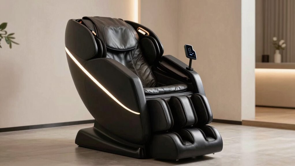 In choosing a professional massage chair, prioritizing technology integration can considerably enhance your relaxation experience. Modern chairs use AI-driven body scanning to automatically identify key tension points, ensuring targeted relief. Smart touchscreens and voice controls make it easy to customize your massage without hassle. Built-in Bluetooth speakers and connectivity options let you enjoy music or audio therapy during your session, creating a calming environment. Many models also feature wireless charging pads and app control, enabling remote adjustments and personalized settings. Additionally, advanced features like zero gravity positioning and adjustable rollers are often programmable, delivering consistent, tailored wellness experiences. These technological enhancements not only boost convenience but also guarantee your massage is as effective and relaxing as possible.